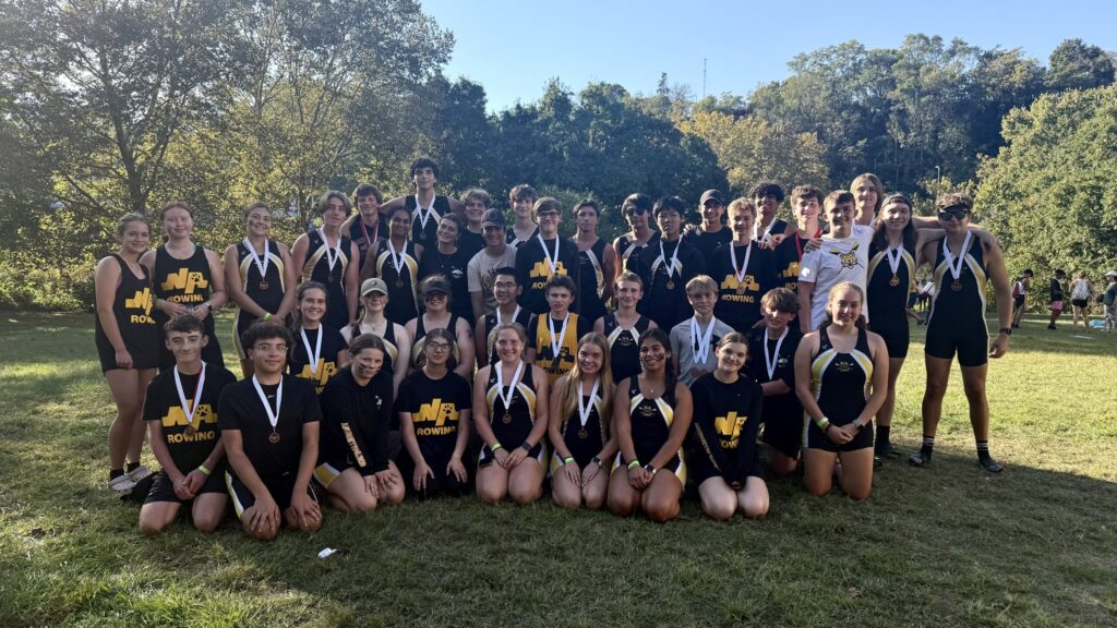 The Women’s Novice 4+ (Sloane Wetzel, Alexis Sardonia, Abby Lambert, Kate Elliot, coxswain Emma Coca) raced next, finishing 4th in a gritty performance. The Men’s Novice 8+ (Ethan Murick, Maxx Buffat, Finn Maguire, Jace Laker, Max Karn, Corrado Salvatore, Bryce Munroe, Wyatt Johansen, and coxswain Elise Kreiling), a combination of both novice 4+ lineups, capped off a strong debut for North Allegheny’s newest rowers with a 3rd place result, earning another medal and demonstrating strong team potential moving forward.